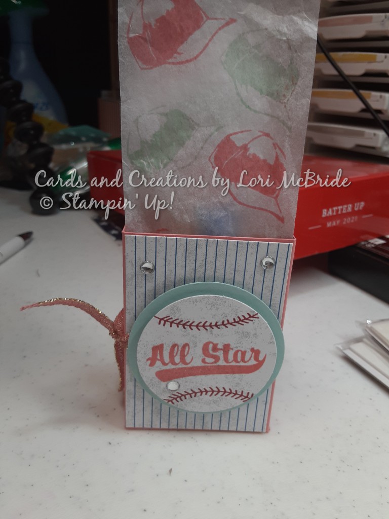 For our fourth and final Alternate Project using the May 2021 “Batter Up” Kit, we created a box out of Flirty Flamingo Cardstock. I’ll provide exact measurements below in just a minute. Using our Stampin’ Trimmer we cut a specific length and height from the “pinstripe” cardbase from the Kit and adhered it to the front of the box. Using the 2 1/2″ Layering Circles Dies we die cut a circle using our Stampin’ Cut and Emboss Machine. We stamped the “All Star” sentiment from the Kit Stamp Set in Flirty Flamingo Ink and added Stampin’ Dimensionals to the back of the “softball” die cut and added it to the center of the Pool Party Circle.